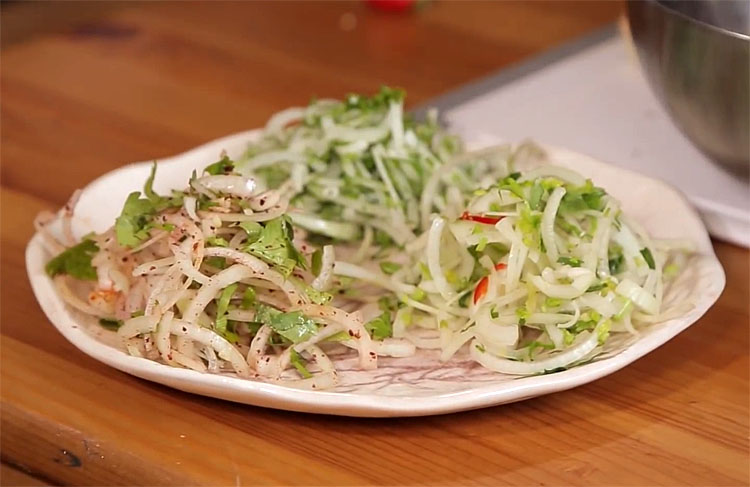 Третий вариант маринада вдохновлен юго-восточной Азией. К луку добавьте стебли кинзы, зеленый базилик, немного имбиря и острый красный перец. Добавьте каплю соевого соуса, но не больше половины чайной ложки. Тщательно перемешайте.
