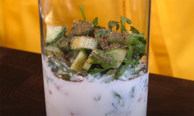 В глубокую чашу блендера пересыпаем орехи, очищенный чеснок и мелко нарезанную петрушку. Следом вливаем кефир, добавляем соль, специи и 1 некрупно нашинкованный огурец. Перемалываем все до полной однородности.
