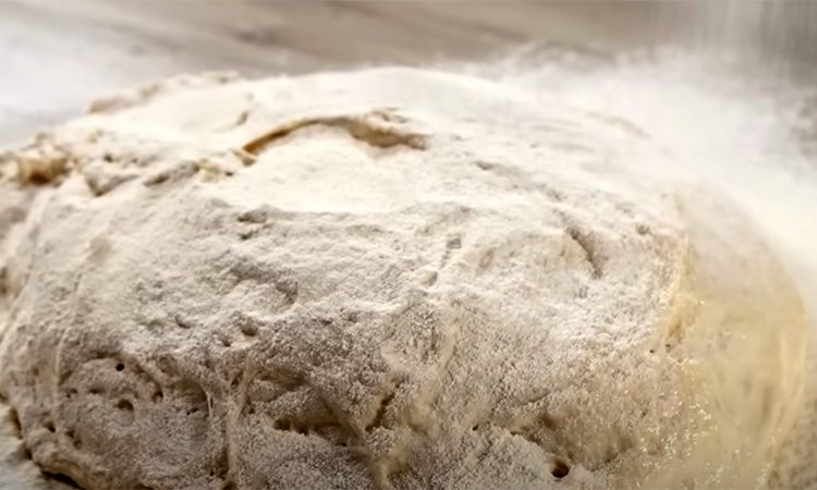 Покройте тесто и оставьте на 20 минут для второй подготовительной стадии. Затем сложите тесто с помощью лопатки, чтобы лишний воздух вышел. Повторите эту операцию еще два раза с интервалами в 15 минут.