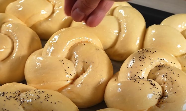 Посыпьте верхушки булочек маком. Разогрейте духовку до 180°C и отправьте булочки выпекаться на 35 минут.
