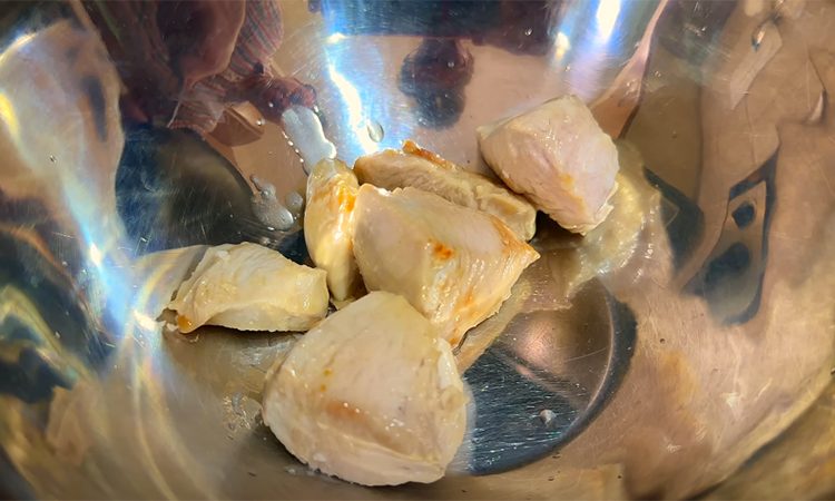 Куриную грудку нарежьте достаточно крупными кубиками и сразу обжарьте ее, всего минуту на заранее разогретой сковороды. Снимите в сторону и на том же масле пассеруйте нарезанный тонкими полукольцами лук, болгарский перец, помидор. Через минуту добавьте сюда же сушеный чеснок, соль и перец, верните курицу.