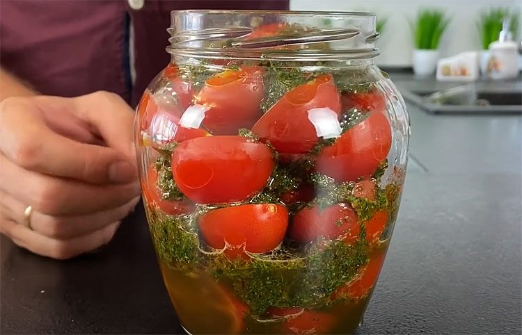 Возьмите стеклянную банку и начните слоить в ней помидоры и заправку. Начинайте с одного слоя помидоров, затем выложите на них небольшое количество заправки. Повторяйте этот процесс, пока не заполните всю банку. Последний слой должен быть заправкой. Убедитесь, что все помидоры покрыты заправкой. Плотно закройте банку крышкой.