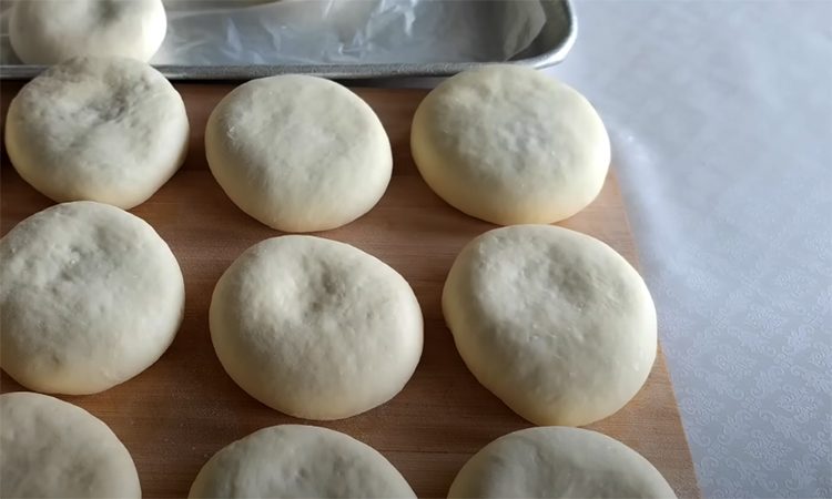 К этому моменту поднялось и тесто. Разделите его на небольшие кусочки и скатайте их в шарики. На рабочей поверхности раскатайте каждый шарик теста в круглую лепешку. Выложите небольшое количество начинки на центр каждой лепешки: