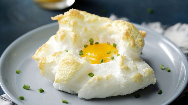 Сформируйте белковую массу таким образом, чтобы в середине образовалось небольшое углубление. Поместите белки в разогретую до 180 °C духовку на 3 минуты. Края «облачка» должны немного подрумяниться, а остальная часть должна остаться белой.