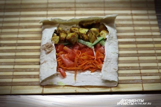Когда все продукты готовы, разворачиваем лист лаваша. Начинку выкладываем на середину – овощи, мясо, сыр — сверху поливаем соусом. Подгибаем лаваш снизу, частично накрывая начинку – примерно 1/3 часть. Сворачиваем лаваш рулетом.