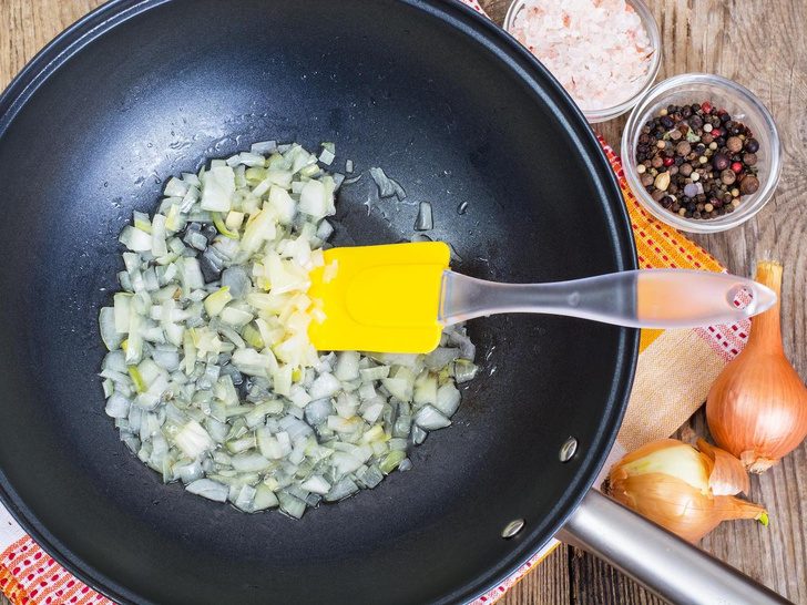 В большой сковороде на среднем огне разогрейте масло. Поместите в нее лук и готовьте, периодически помешивая его, пока он не станет мягким, около 7 минут.