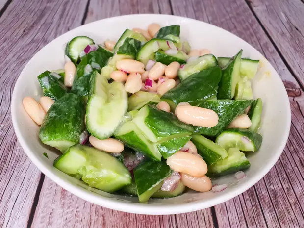 Нам понадобится: 3 средних огурца, 4 ст.л. белой фасоли в собственном соку, 0,5 перчика чили, 0,5 небольшой красной луковицы, 1 ст.л. дижонской горчицы, 2 ст.л. винного уксуса, 2 ст.л. оливкового масла, соль, перец, зелень петрушки.