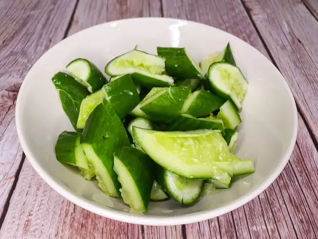 Разрезаем каждый огурец сначала вдоль, а потом нарезаем на кусочки слегка по углом, чтобы вышло красиво.