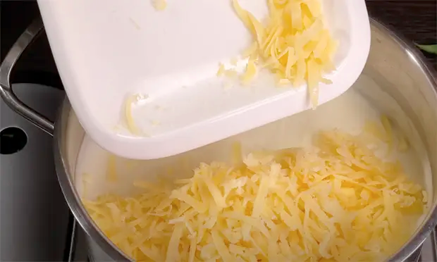 Поставьте кастрюлю на огонь, вылейте в нее молоко и добавьте крахмал, все размешайте. После закипания присолите, выложите масло и снова размешайте. Молоко уже загустело. Натрите на мелкой терке немного сыра, пересыпьте его в кастрюлю и снова размешайте.