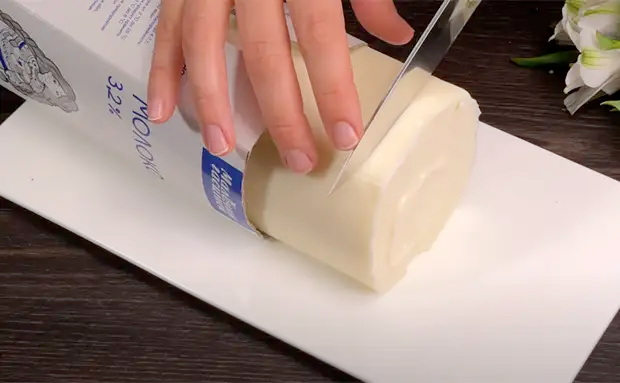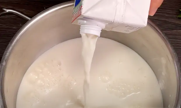 Дайте смеси закипеть, выключите огонь и чуть остудите. Также подготовьте картонный пакет: просто срежьте верхнюю часть и форма для сыра готова.
