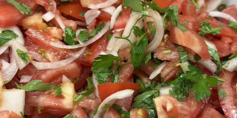 Для приготовления закуски вам понадобятся: помидоры — 5 штук, чеснок — 4 зубчика, лук — 3 штуки, растительное масло — 4 ст. ложки, сок лимона — 2 ст. ложки, мёд — 1,5 ст. ложки, соль — 0,5 ч. ложки, острый перец, базилик и зелень — по вкусу. Нарежьте помидоры крупными кружочками, чеснок и зелень измельчите, лук порежьте кольцами. В отдельной ёмкости смешайте мёд, растительное масло, сок лимона, острый перец, соль и базилик. Эта смесь и будет являться заправкой для закуски.