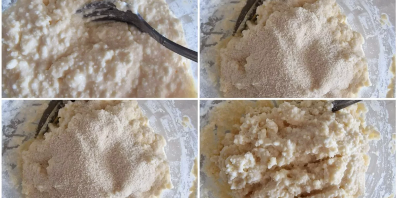 Ингредиенты на пачку творога 250 гр: одно яйцо, столовая ложка муки (я предпочитаю рисовую), две столовые ложки манки, сахар по вкусу и щепотка соды. Творог нужен крупный. Размять его вилкой в отдельной ёмкости, добавить яйцо и сахар. Перемешать и оставить на 8-10 минут. Это важно, так как творог выделяет сыворотку, из-за которой сырники и расползаются при приготовлении. Затем добавить муку и манку, которые впитают эту жидкость. Перемешать до плотной консистенции. Тесто должно хорошо формироваться в шарики.