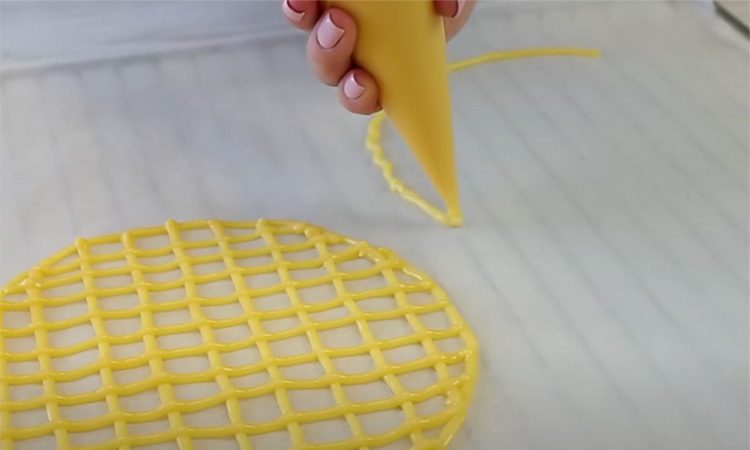 Запеките их 9 минут при 210 градусах в духовке. Осталось только собрать торт вместе. Первый корж положите на плоскую тарелку и нанесите на него сетку крема. Поставьте сверху кондитерское кольцо и чередуя коржи и крем заполните его до конца.