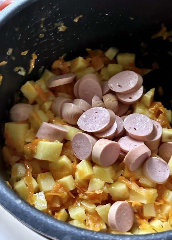 Сосиски были лишними – это да. Строго говоря, любая колбаса, например копчёная или «охотничьи» же сосиски будут ненужными. Только рёбрышки или слегка прижаренный бекон для аромата. Но это – исключительно ИМХО.