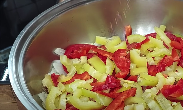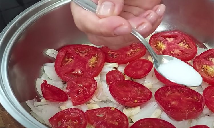 Нарезанный полукольцами лук выложите первым слоем на сухую сковороду. Следом измельчите сюда же чеснок, поставьте сковороду на слабый огонь. Накройте лук с чесноком дольками помидоров, добавьте нарезанный полосками перец.