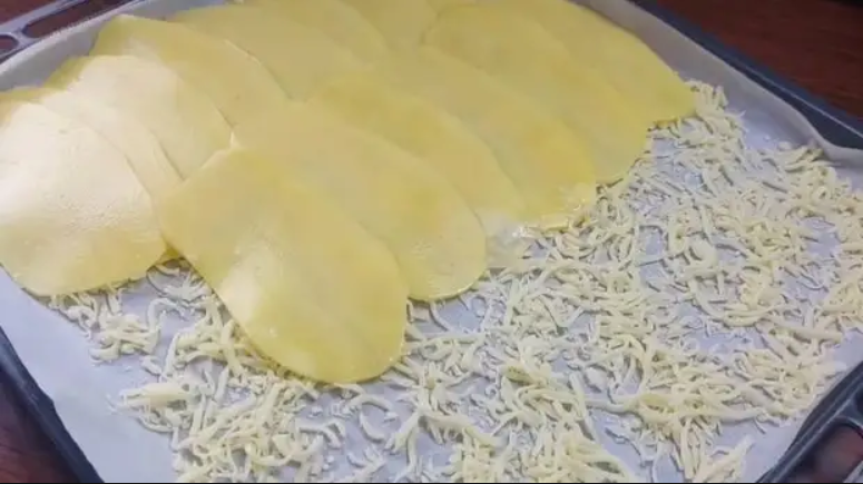 Картофель очистите и порежьте максимально тонко на ломтики. Присолите по вкусу. На противень, выстеленный пергаментной бумагой, распределите 150 гр. тёртого сыра, а поверх него — картофель.