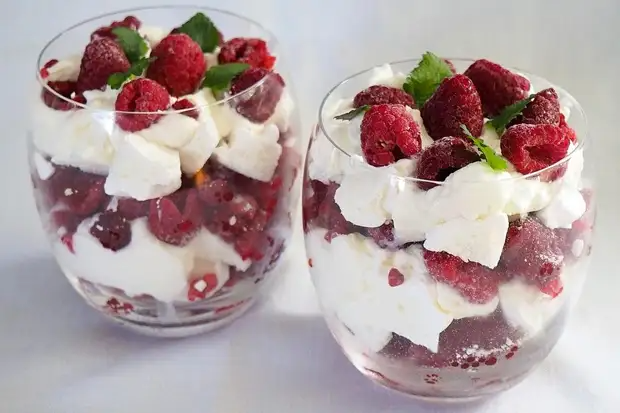 А теперь все это слоями укладываем в порционные креманки или бокалы, так, чтобы последним был слой малины на сливках.