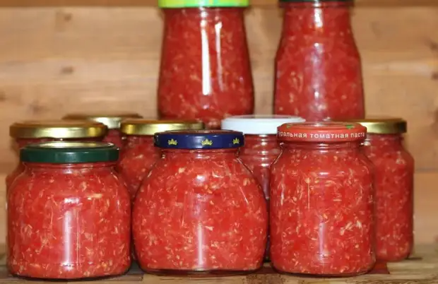 Из указанных пропорций получается примерно 600 г хреновины. Но объем зависит от сочности помидоров.