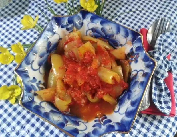 Перец нарезать, помидоры пропустить через мясорубку вместе с чесноком.