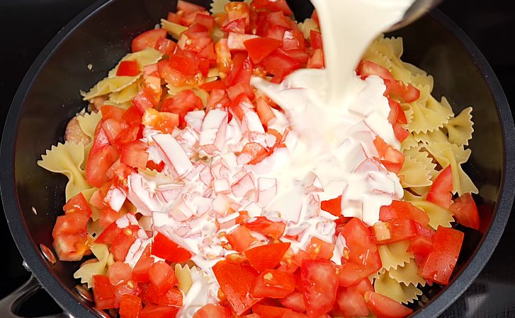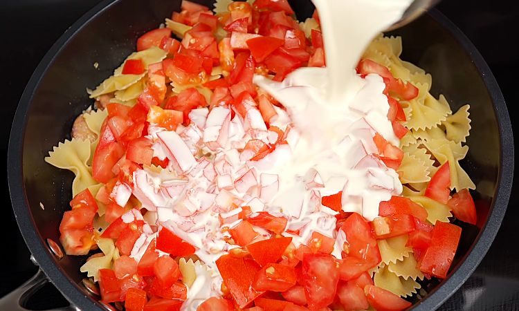 3. Добавьте к луку кружки сосисок (или колбасу) и обжариваем 1-2 минуты. После добавляем мелко нарезанный чеснок и жарим пол минуты. Разложите сверху сухие макароны и помидоры. Затем добавьте сливки и куриной бульон.