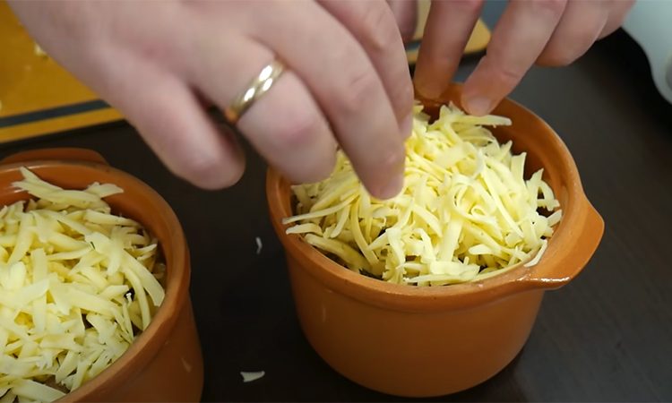 Хорошо перемешиваем и равномерно разливаем по горшочкам. Сверху распределяем натертый на крупной терке сыр, чтобы сформировалась аппетитная корочка. Прикрываем горшочки фольгой, ставим в холодную духовку. Включаем разогрев до 190 градусов и запекаем ровно час.