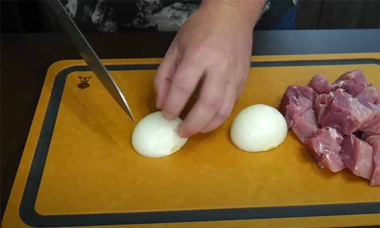 В сковородку наливаем небольшое количество подсолнечного масла и обжариваем нарезанное небольшими кубиками мясо до румяной корочки. Сюда же некрупно шинкуем лукУ нас нет цели довести его до полной готовности, самое главное — придать аромат.