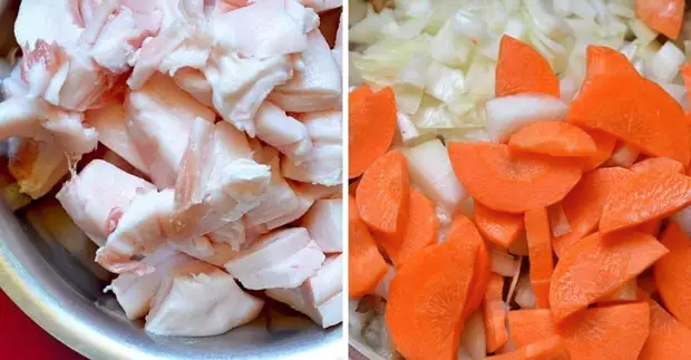 Печень, мясо и сало нарежьте маленькими кусочками. Пропустите всё это через блендер или мясорубку.