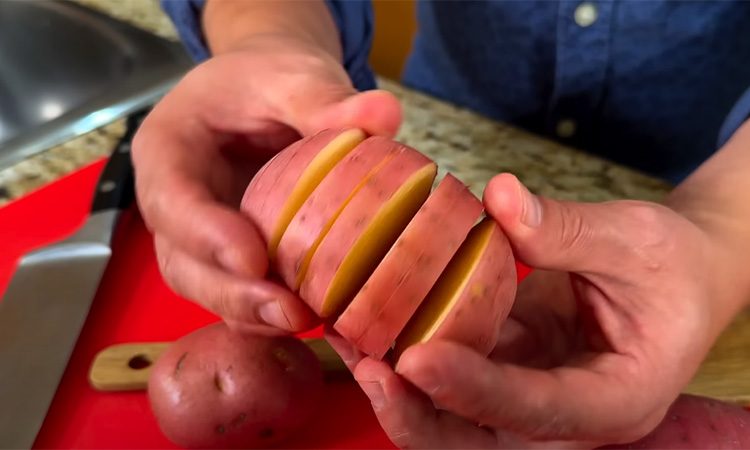 Картофель не чистим, но тщательно промываем. Затем делаем по всей длине клубня глубокие надрезы, не до конца. Достаем мясо, снимаем фольгу. Выкладываем к мясу картофель, подсаливаем его.