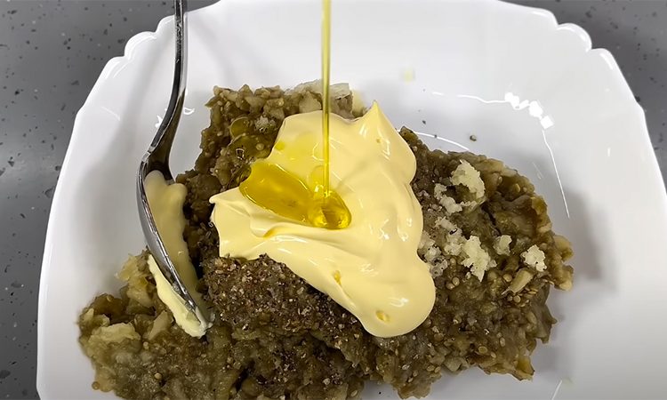 Порубите мякоть баклажанов и перемешайте ее с прессованным чесноком, молотым перцем, небольшим количеством майонеза и растительным маслом по вкусу.
