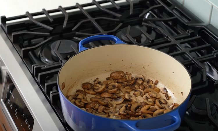 Равномерно распределите говяжий фарш на противнеми. Посолите и поперчите. Запекайте в режиме верхнего обогрева духовки (2-й уровень сверху) в течение 10-15 минут, периодически переворачивая. Дайте остыть в течение 5-10 минут, затем раздробите фарш. В глубокой кастрюле или горшке разогрейте растительное масло на среднем огне. Добавьте нарезанные грибы и щепотку соли. Помешивайте и жарьте 2-3 минуты до выделения сока и золотистой корочки на грибах.