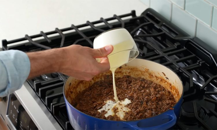 Влейте сливки в фарш и потомите буквально немного. Далее добавьте сметану и горчицу. Снова перемешайте, после чего можно добавлять в кастрюлю пасту.