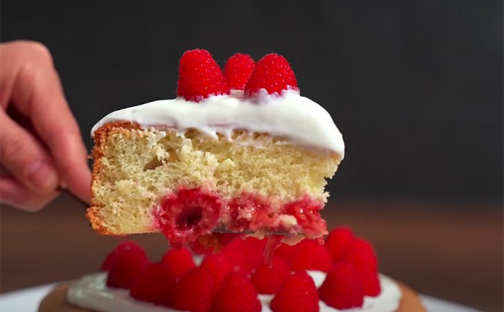 Этот рецепт пирога наверняка станет одним из любимых для всей семьи. Нежный, воздушный как облако, с ягодами малины, он получается намного вкуснее дорогих кондитерских тортов. В основе рецепта лишь 100 граммов муки, столько же сахара и 3 яйца.