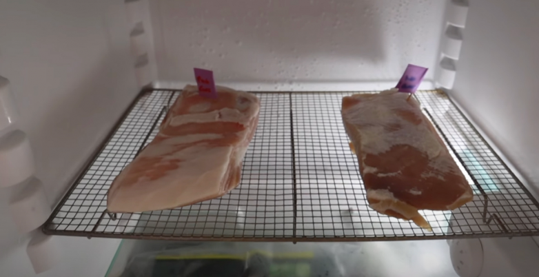 Через 7 дней смыл соль с кусков и оставил подвялить на решетках в холодильнике в течение 48 часов.