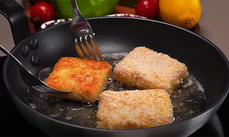 Для этого нужно вернуть заготовку из морозилки на рабочую поверхность. Аккуратно разделить на небольшие квадратики, каждый из них опустить сначала во взбитые яйца, затем в панировку. Теперь их достаточно быстро обжарить до золотистости с обеих сторон.