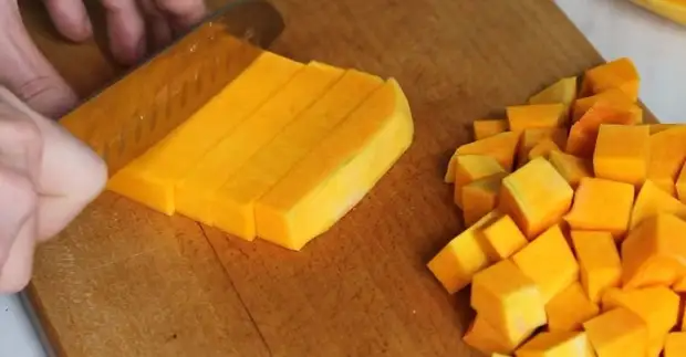 Начните с подготовки самой тыквы. Очистите ее от кожуры и семян, а мякоть нарежьте на небольшие кусочки (толщиной 5–7 мм).