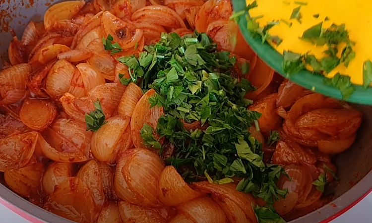 Лук редко играет роль основного компонента полноценного блюда, но данный рецепт является исключением из этого правила. Из всего восьми маленьких луковиц мы приготовим удивительно вкусный гарнир, который может также служить самостоятельной закуской. Специи и зелень придают блюду дополнительный вкус.