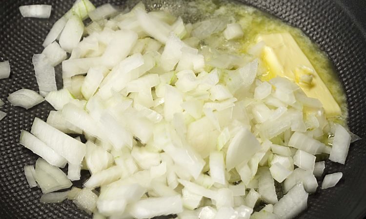2. Разогрейте сковороду с высокими бортами и добавьте сливочное масло. Обжаривайте мелко нарезанный лук в течение 5 минут на среднем огне до золотистой поджарки.