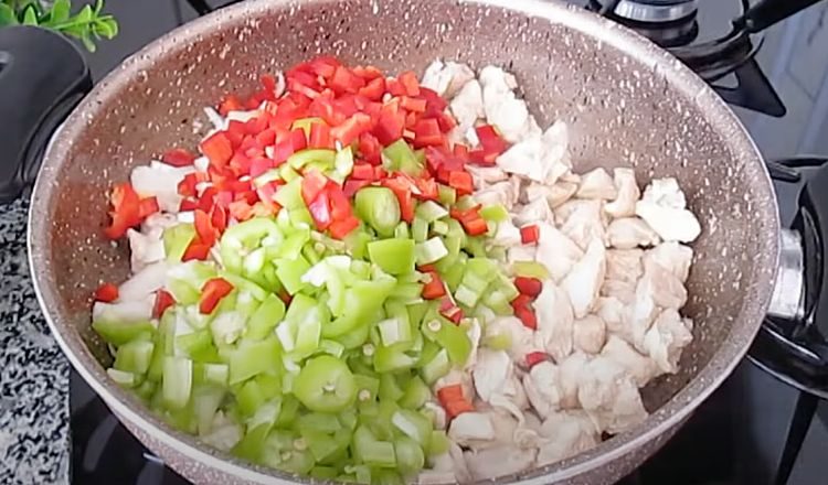 2. Приготовление куриной грудки с овощами. В это время подготовьте ингредиенты для куриной грудки с овощами. Куриную грудку, зеленые перцы, красный перец и помидоры нарежьте небольшими кубиками. В большой сковороде разогрейте оливковое масло на среднем огне.Обжаривайте куриную грудку до золотистой корки с обеих сторон. Это займет около 5-7 минут.