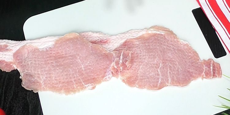 2. Положите свиную вырезку на кухонную доску и нарежьте ее на тонкие отбивные с помощью острого ножа. Отбивные должны быть примерно одинаковой толщины, чтобы их было легко скрутить в рулет. Положите отбивные между двумя листами пленки или пластиковой пленки и аккуратно отбейте их, чтобы они стали еще тоньше. Это поможет мясу легко складываться.