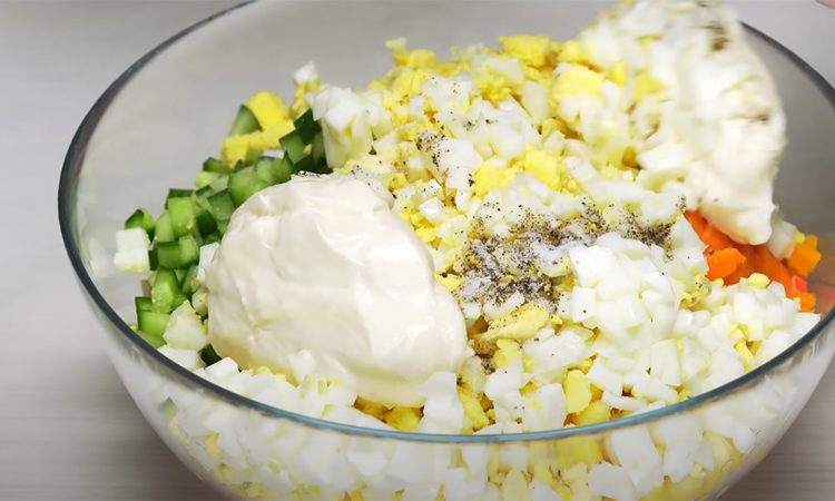 Яйца заранее отвариваем вкрутую и чистим, морковь варим до готовности и охлаждаем. Огурец сначала разрезаем вдоль и удаляем из него семена обычной чайной ложкой. Только после этого режем огурец мелкими кубиками.