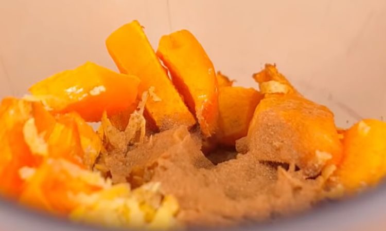 1. Предварительно разогрейте духовку до 180 градусов. Нарежьте тыкву на кубики и распределите их на противне. Запекайте тыкву в предварительно разогретой духовке в течение 40 минут.