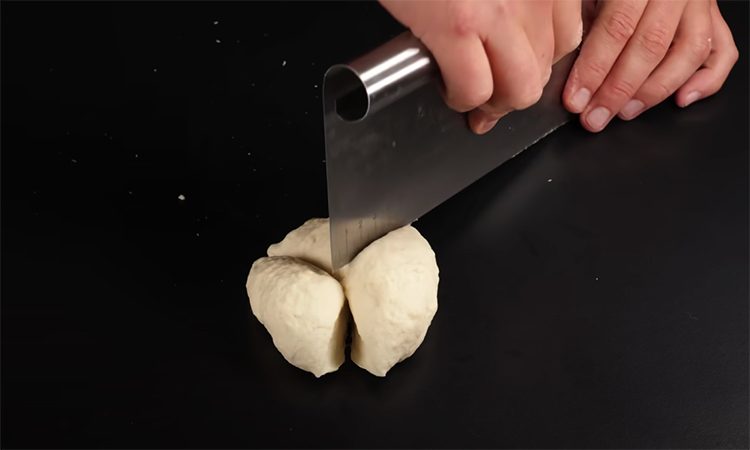 В глубокую миску пересыпьте муку, соль и разрыхлитель. Растопите сливочное масло, влейте его сюда же, затем добавьте воду и замешайте нежное тесто. Расстойки ждать не нужно, сразу вымешайте его еще раз на рабочей поверхности и разделите на три части.