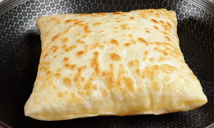 Теперь разогрейте масло в сковороде и выложите в него заготовку. Тесто с сыром начнет надуваться внутри, одновременно поджариваясь снаружи.