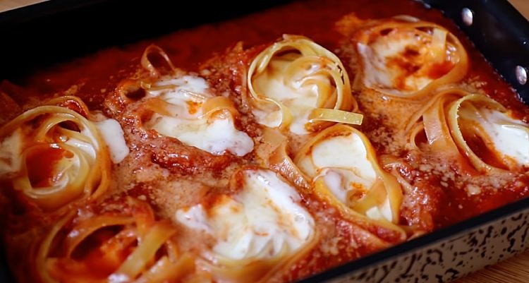 Даже обычные макароны могут превратиться в изысканное блюдо, словно из дорого ресторана, нужно только знать правильный рецепт. В этом случае, готовить их будем без предварительной варки, а непосредственно в духовке. Зальем томатным соусом и дадим им потушиться в течение 45 минут.