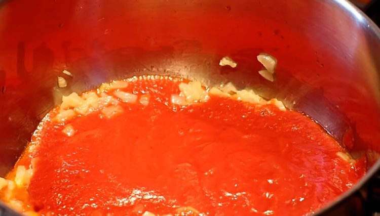 1. Подготовка особого томатного соуса. В глубокой сковороде на среднем огне начните обжаривать лук, пока он не станет золотистым. Добавьте томатную пасту и стакан кипяченной воды в сковороду, посолите, и дайте всему томиться в течение 10 минут.