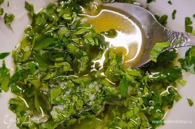 Чеснок натереть на мелкой терке, петрушку мелко нарезать. Если есть душистое подсолнечное масло, то лучше взять его. В масло добавить чеснок, петрушку, лимонный сок и соль по вкусу. Размешать.