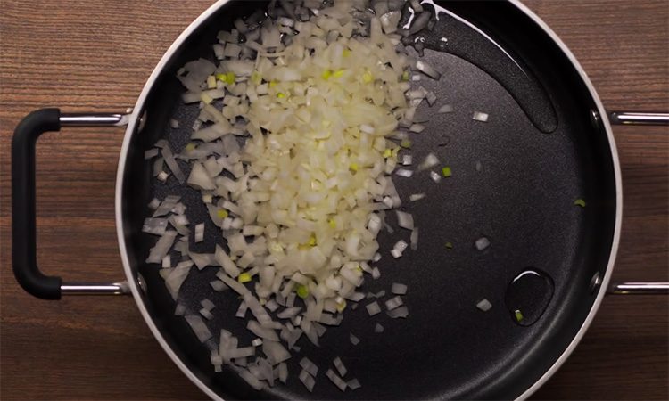 Возьмите кастрюлю и разогрейте на ней 2 столовых ложки растительного масла. Мелко нарежьте репчатый лук и обжаривайте его на среднем огне в течение 2 минут, пока лук не станет золотистым. После этого добавьте натертую морковь в кастрюлю и продолжайте обжаривать еще 2 минуты, регулярно помешивая.