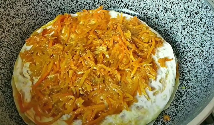 3. Приготовление лепешек. Разделите тесто на небольшие порции и раскатайте их в тонкие круглые лепешки. Обжарьте первую лепешку на разогретой сковороде 30 секунд. Сверху положите небольшое количество морковной начинки. Поверх положите следующую лепешку и продолжайте слоеную сборку до завершения ингредиентов, каждый раз переворачивая.