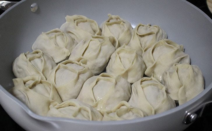 Добавьте 200 мл кипятка в сковороду, уменьшите огонь и прикройте крышкой. Готовьте манты на пару под крышкой в течение 15 минут, чтобы начинка окончательно приготовилась.