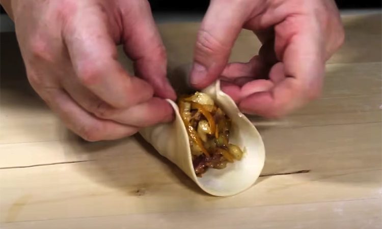 Соберите манты: На одну половину теста положите начинку (говяжье филе, бараньй жир, лук и тыкву). Защипните тесто так, чтобы оставить верхнюю часть открытой и придайте мантам характерную форму.